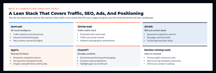 For $50-200 per month, you can access competitor data that would’ve cost $10,000+ to compile manually five years ago. That’s not a small advantage. That’s the entire playing field shifting.