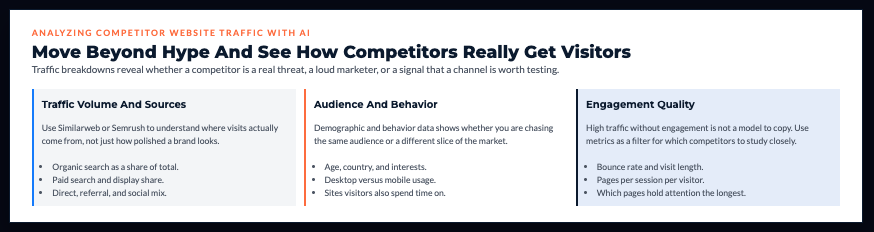 Competitor analysis shows you where to place your bets. If organic search drives 70% of competitor traffic, that’s where you focus SEO efforts. If their email list is their main revenue driver, you prioritize list building. If they’re crushing it on one platform and ignoring others, you’ve identified both an opportunity and a warning.