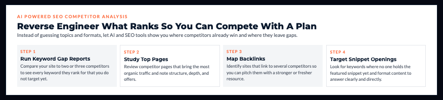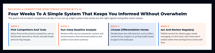 - Pick 1-2 AI tools based on your budget (Similarweb free tier + ChatGPT, or Semrush/Ahrefs if you can invest)