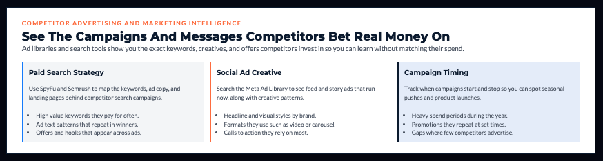 - Paid search (20%+): Heavy ad investment. Use SpyFu to see their keywords and ads.