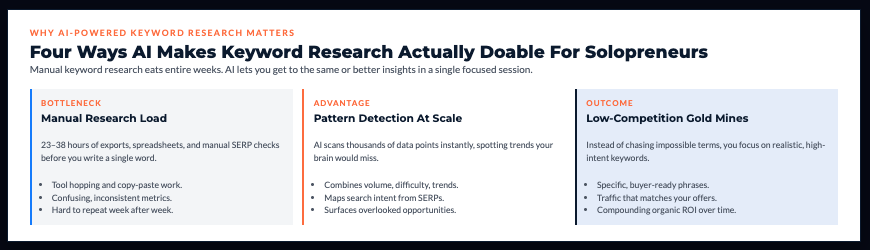 What typically happens: A solopreneur using AI tools knocks out comprehensive keyword research in 45-90 minutes that would’ve taken them two weeks manually. Same quality insights, 95% less time investment.