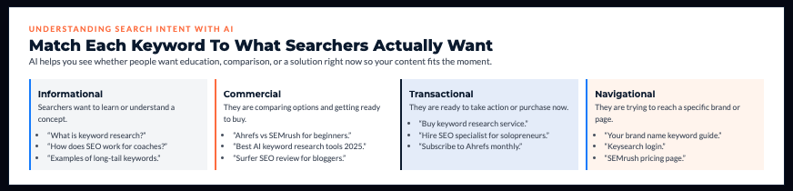AI analyzes the actual search results to tell you which intent Google thinks that keyword represents. You create content that matches that intent, which means you actually have a shot at ranking.