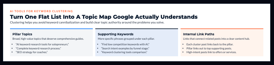 - AI clustering that groups related terms automatically