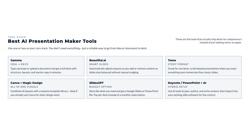 Let’s cut through the noise. These are the AI presentation makers that actually deliver value for solopreneurs.