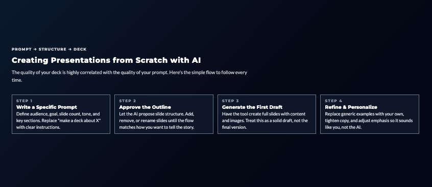 The fastest way to go from idea to finished presentation is using AI generation. Here’s how to do it effectively.