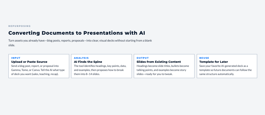 Different approach: Instead of traditional slides, Tome creates flowing narrative pages. Good for thought leadership content, case studies, or situations where linear slides feel limiting.