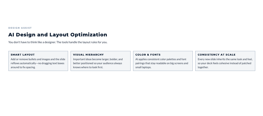 AI tools ensure your visual presentation matches the quality of your actual work. You’re not losing opportunities because your deck looked unprofessional.