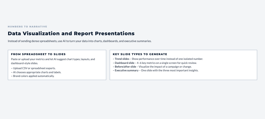 For recurring reports (monthly metrics, quarterly performance), AI creates dashboard-style slides that present multiple data points clearly on one screen.